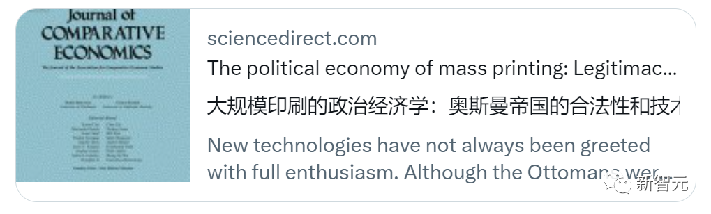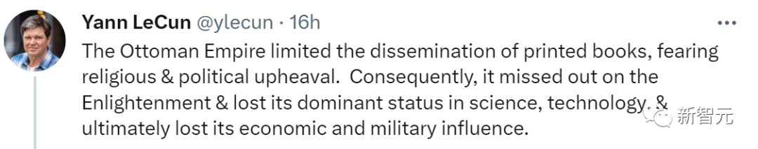 他评论道:「由于担心动荡,奥斯曼帝国限制了印刷书籍的传播。因此,它错过了启蒙运动,失去了在科学技术上的主导地位,并最终失去了经济和军事上的影响力。」
