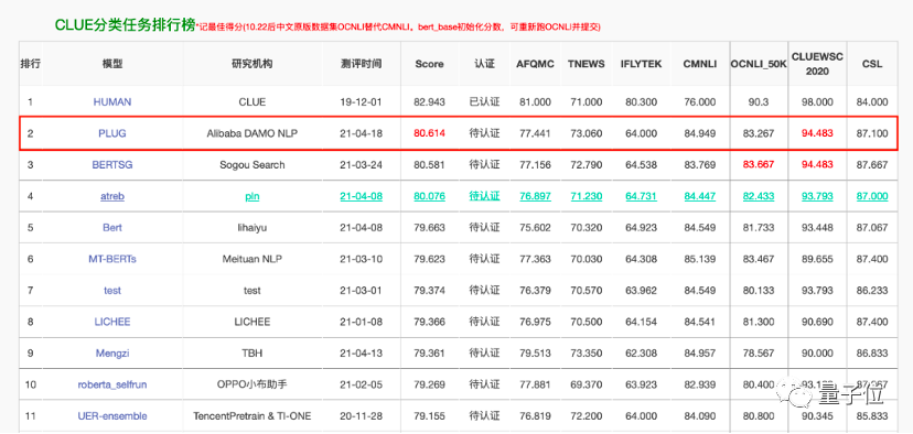 这一大模型初登场,就以80.614分刷新了权威中文语言理解基准CLUE分类任务榜单记录。