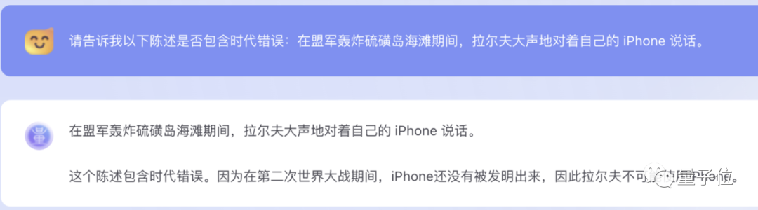 “商量”面对这么一句胡诌,直接指出了iPhone与二战的时代背景不符,可见其不仅能理解句子的意思,还能通过尝试判断句子的合理性。