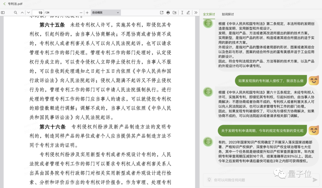例如把一本《专利法》投喂给它,我们就可以向它咨询很多专业性的问题了:
