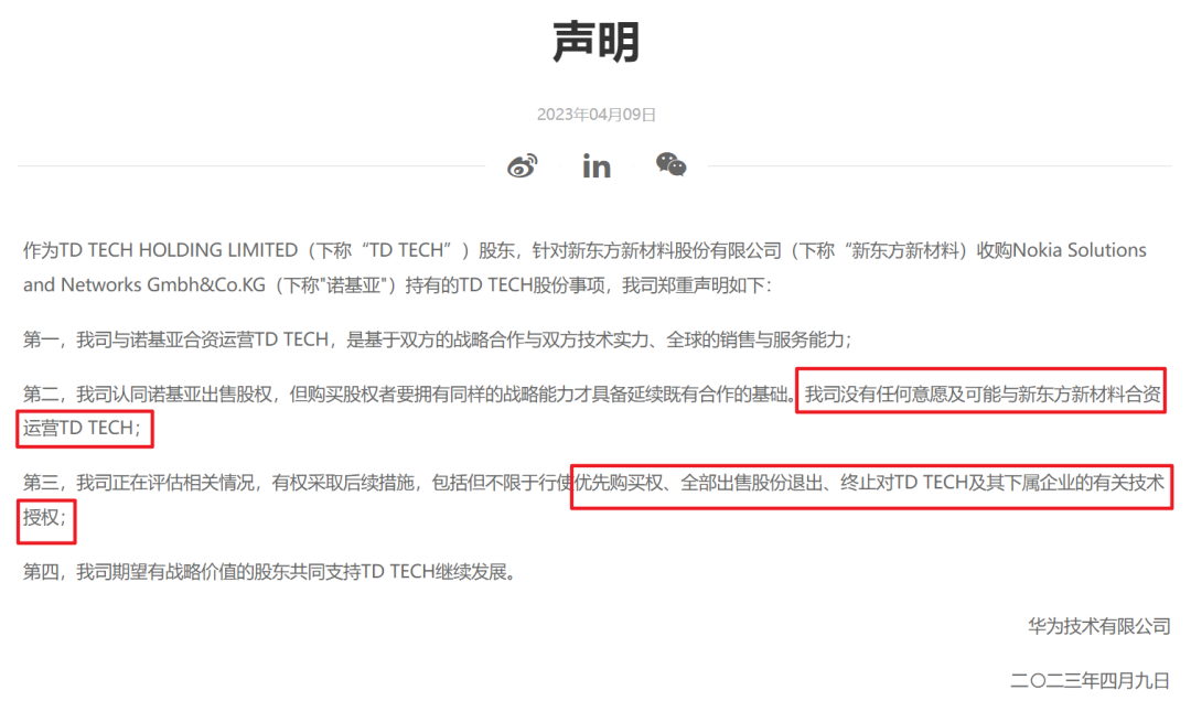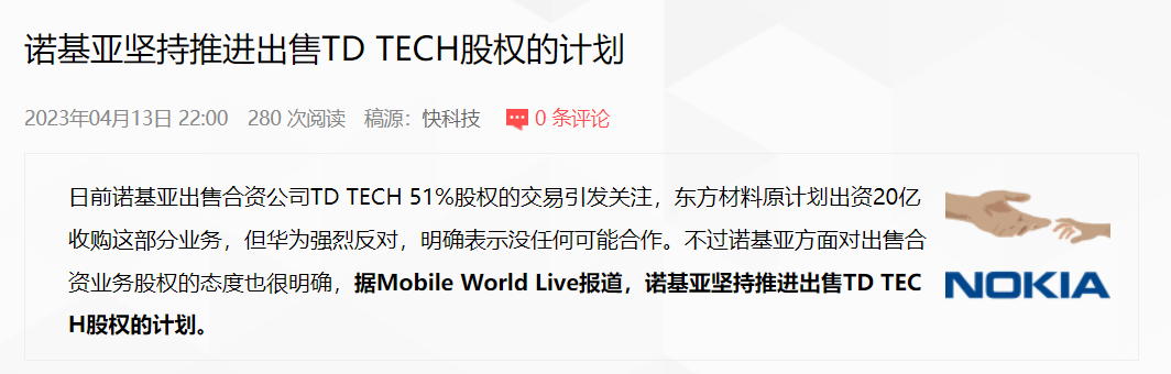 新东方新材料计划以21.2亿收购华为与诺基亚合资的TDTECH51%股份,引发华为与诺基亚的反对。华为明确表示不参与,诺基亚则坚持不卖其股权。TDTECH原为西门子与华为的合资公司,后因技术发展转向行业专网通信,因华为制裁而转正,现成5G手机品牌。东方材料的跨界收购面临华为技术撤离的风险,而诺基亚则试图摆脱不赚钱的手机业务。