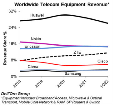 再加上,华为在电信设备领域和它打的有来有回,两家从 3G 时代斗到了 4G 时代。