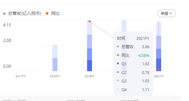 而且业绩状况一直不咋滴,从 2019 年开始,年总营收同比连续下降,到了 2021 年,甚至还进入了负增长。