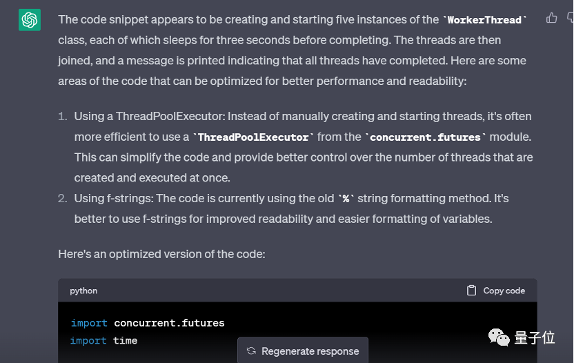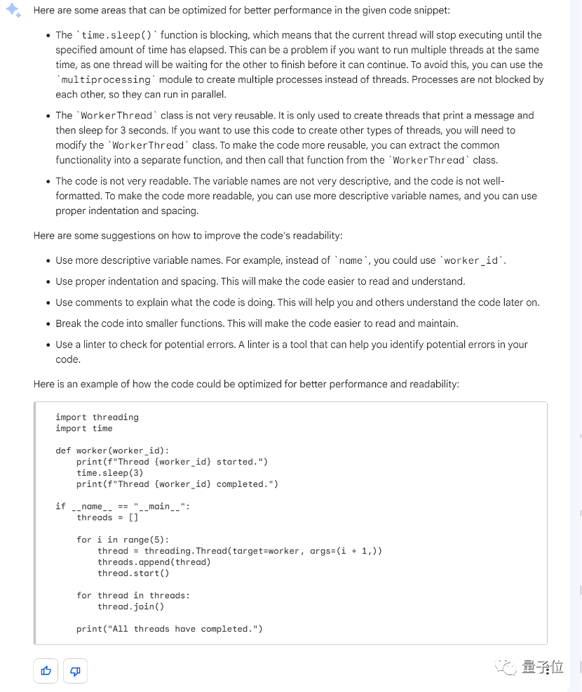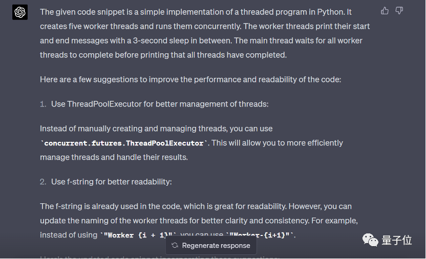 可以看到,GPT-4首先分析了这段代码的用途和实现方式,随后提出了一些提高代码性能和可读性的建议。不仅如此,GPT-4还给出了修改后的代码,可以说是答的非常完善了: