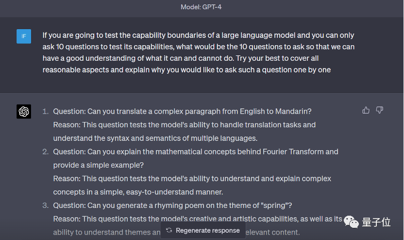 于是GPT-4直接出了10道题,而且还分别告知了出题理由——具体考察了大模型什么能力,可以说是很全面了。