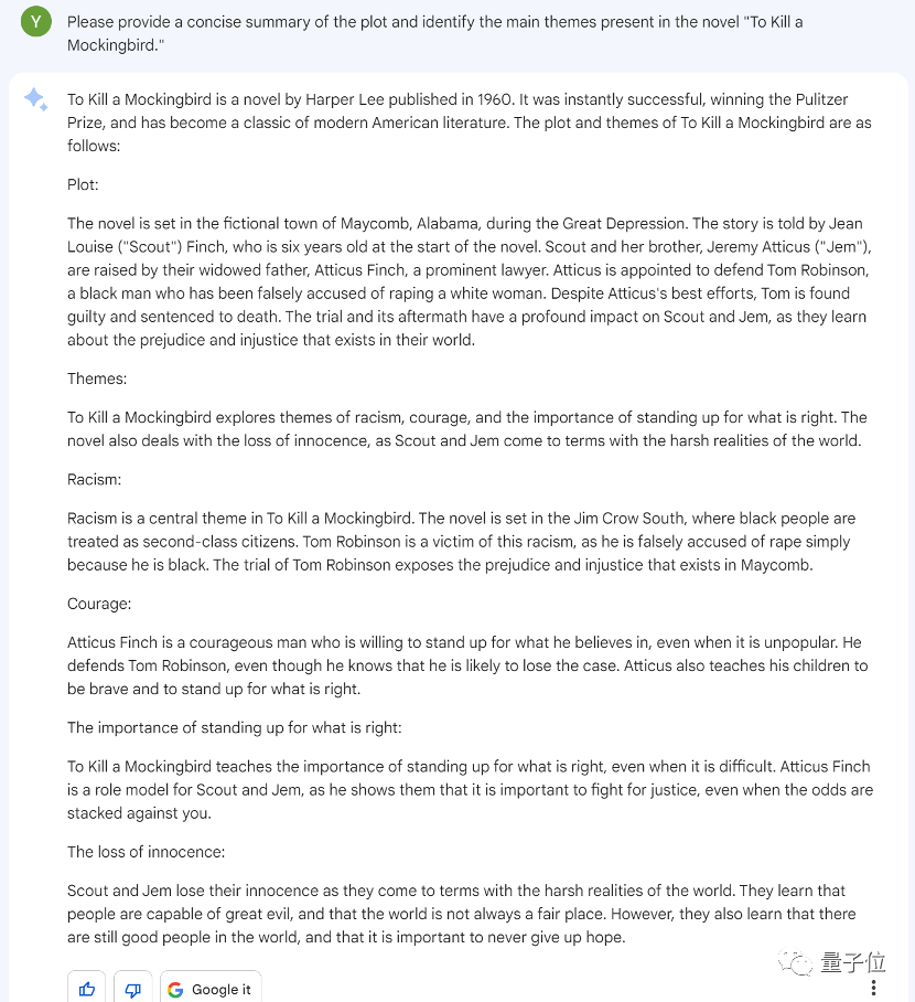 所提供的回答清晰准确地概括了《杀死一只知更鸟》的情节,并指出了主要主题。情节概括简洁明了,捕捉到了故事的核心元素。主要主题解释得很好,它们与小说的关联显而易见。