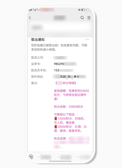 在用户触发了业务场景之后,对客户进行了微信模板消息的触达,但“备注”字段的内容是营销推广内容,同时在里面使用了自定义颜色、emoji 表情符号,意图诱导用户进行点击。