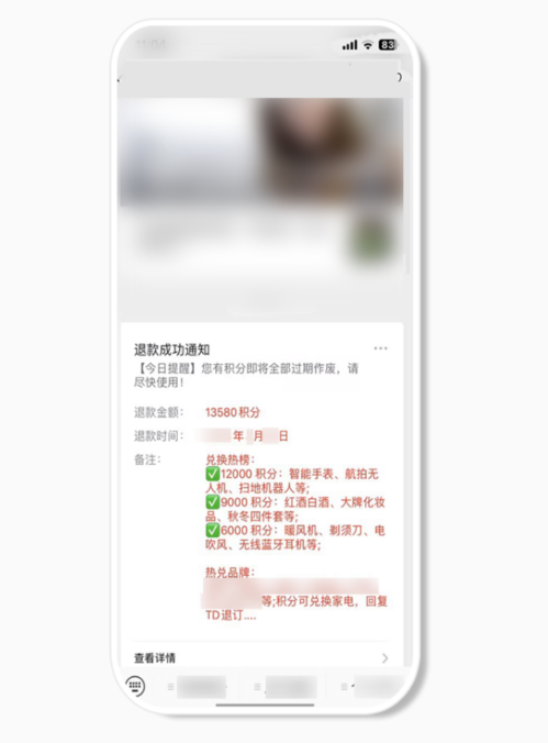 使用的是官方的“退款成功通知”模板,但是内容是纯纯的营销推广内容,这不就是挂羊头卖狗肉吗?