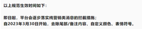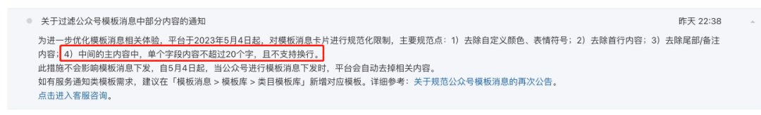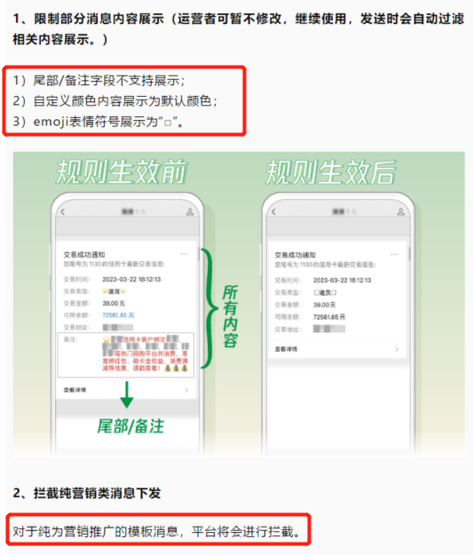 公众号的模板消息能力旨在方便开发者为用户提供服务凭证通知。近期平台发现,部分公众号下发的模板消息涉及包括但不限于商品营销、服务推广等内容。且利用颜色/表情符号诱导用户查看、点击。上述行为损害了用户消息接收体验,给用户带来极大困扰,引起大量用户投诉。