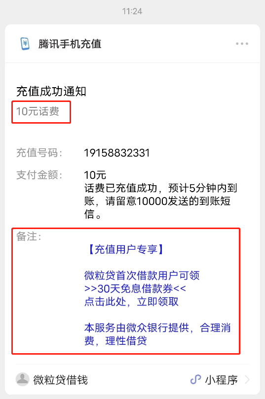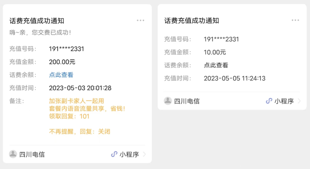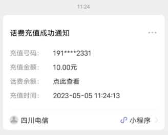 这个是充值话费之后,运营商的官方账号会推送一条消息给我,告知我话费充值成功。这条消息的官方叫法叫做:微信模板消息。