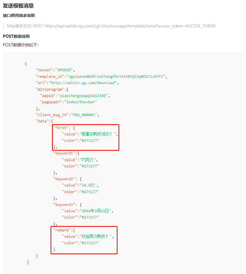 这样“不专业”的感受更多的还体现在官方的接口文档中,在全过程中,截至我写文章的时候,官方的接口文档对于首行(first.DATA)和备注(remark.DATA)字段,一直在变化,但是一直都没有处理干净: