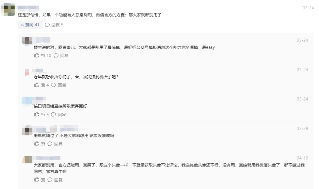 在整个过程中,我作为一个在工作中使用了模板消息的开发者,感受到的是“不专业”,感觉整个事件从提出到落地,都是拍脑子,没有想清楚细节就开始搞事情,导致一个事情反复打补丁,反复被开发者吐槽。