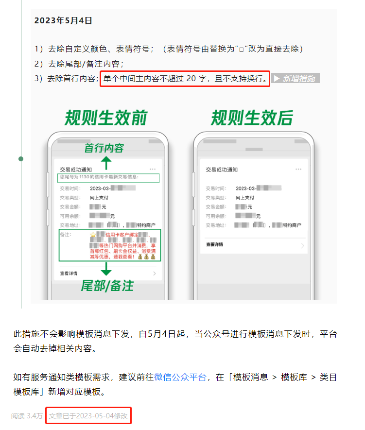 在这个过程中,我最害怕的还是微信突然发公告说,开发者也需要做对应的改动,比如如果调用接口的时候传递了备注字段,则不会发送给客户。幸好,这次并没有出现这种情况,不然我真的会好好的“谢谢”提出这个需求的 PM。