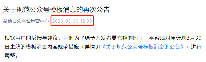 但是据我考察,实际情况是,微信官方想动“模板消息”已经是想了很久了,比如我就找到了 2021 年 1 月 27 日官方发布的这个公告: