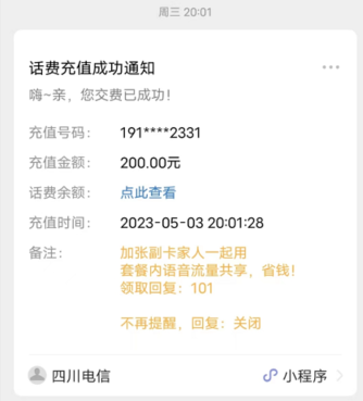 哦,对了,说到文章最开始的话费充值,由于我是直接用的微信钱包充值的,所以我同时收到了这样的一条推送: