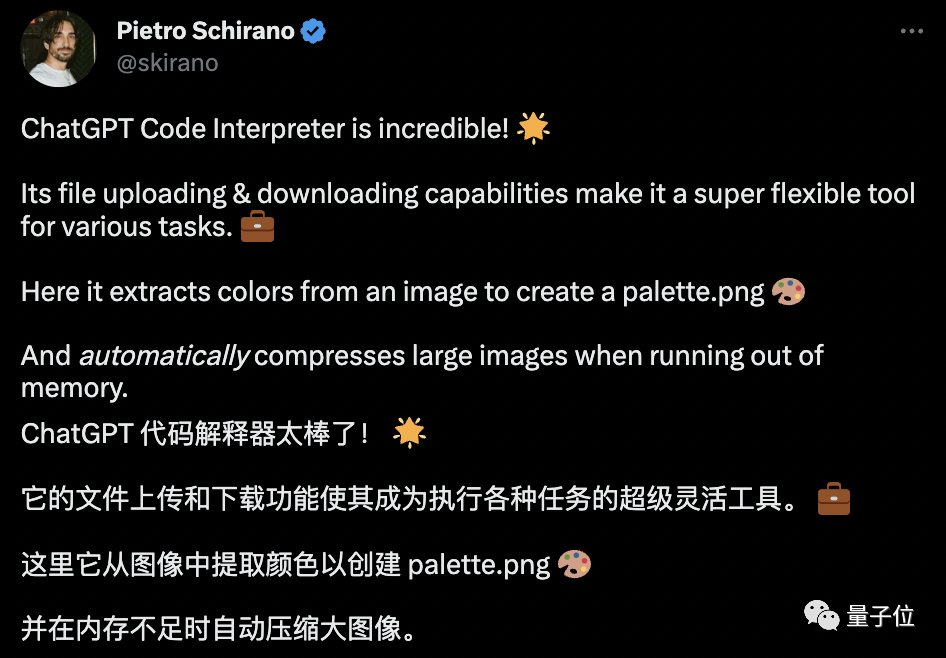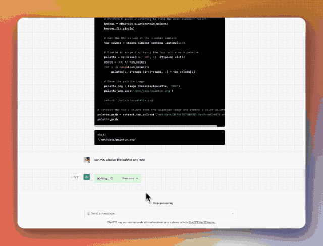 基于文件上传和下载功能,ChatGPT代码解释器还能给设计师们当色彩提取器、图片压缩工具用。