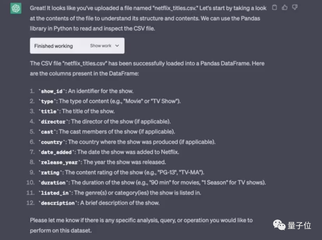 在代码解释器的帮助下,ChatGPT能够调用Python的Pandas库,自动分析出这个csv文件中具体包括哪些信息。