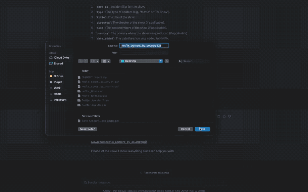 这时候,再告诉ChatGPT你想要重点分析的部分就OK了,比如Netflix在不同地区片源有哪些差异。可以要求ChatGPT将分析结果放进PDF里并提供下载。