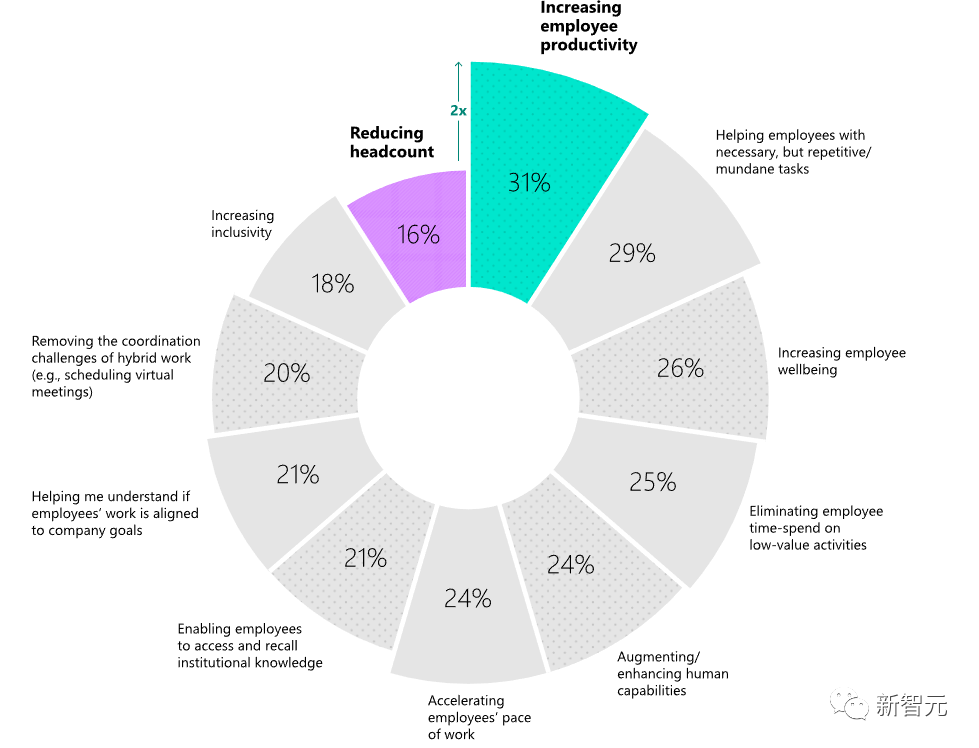 在担心人工智能失业的情况下,当被问及在工作场所最重视人工智能时,老板们选择「提高员工生产力」的可能性是「减少员工人数」的2倍。