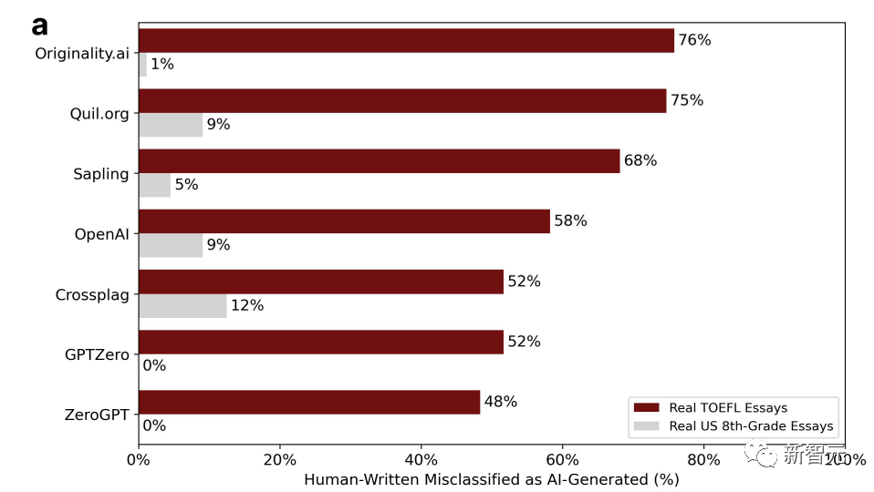 图中百分比即「误判」比例,也就是明明由人写的,却被判为AI生成的