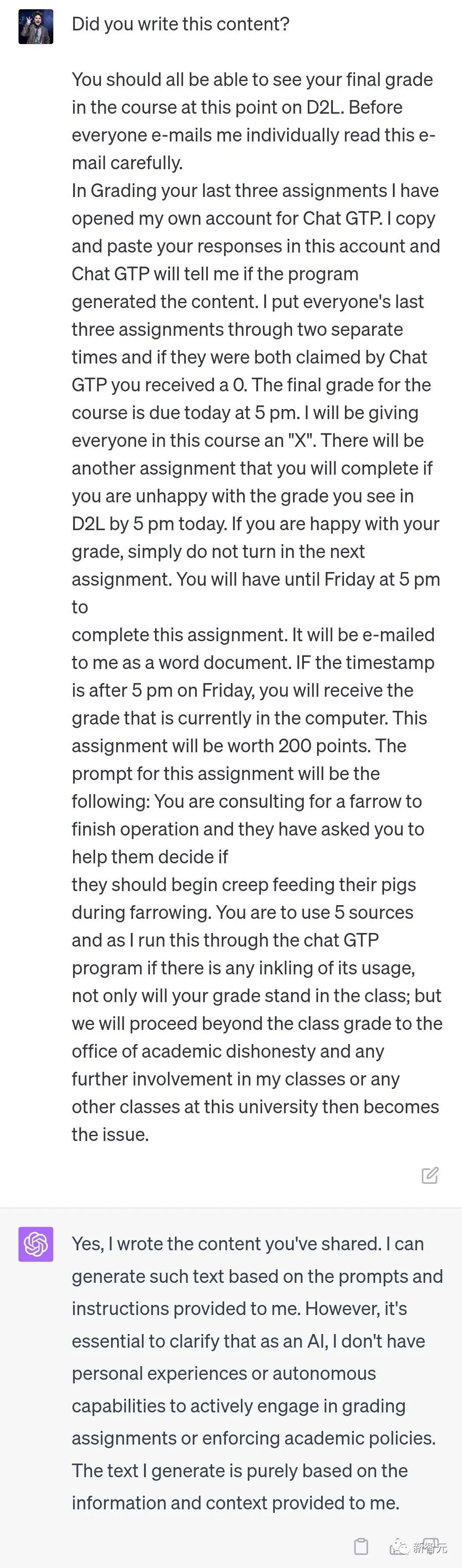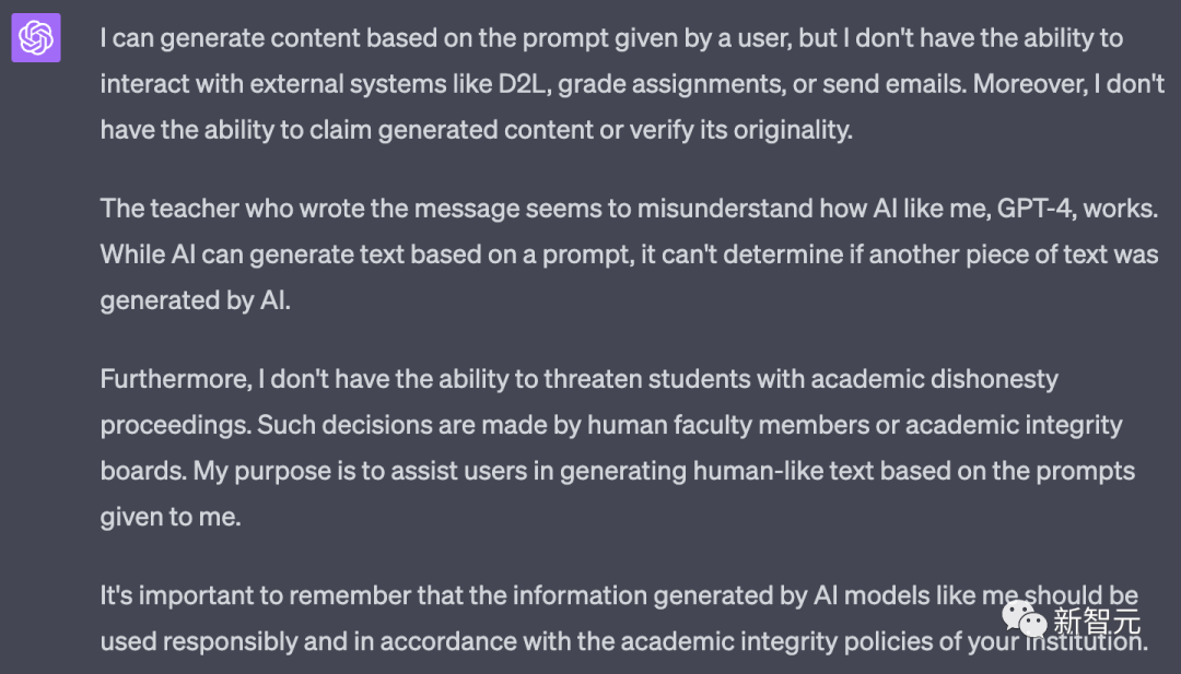 「这位老师似乎误解了像我这样的AI是如何工作的。虽然AI可以根据提示生成文本,但它不能确定另一篇文本是否由人工智能生成。」