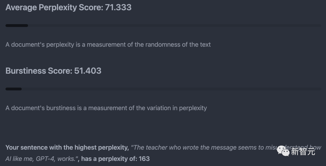 原理上,GPTZero主要靠「困惑度」(文本的随机性)和「突发性」(困惑度的变化)作为指标进行判断。