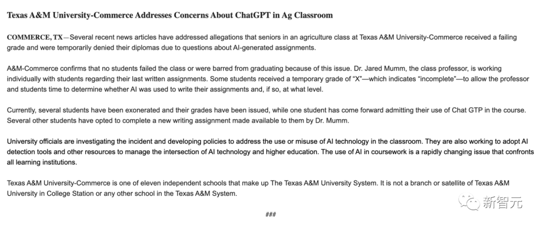 对此,得克萨斯农工大学商学院表示正在调查这一事件,但并没有学生不及格,也没有人因为这个问题被延毕。