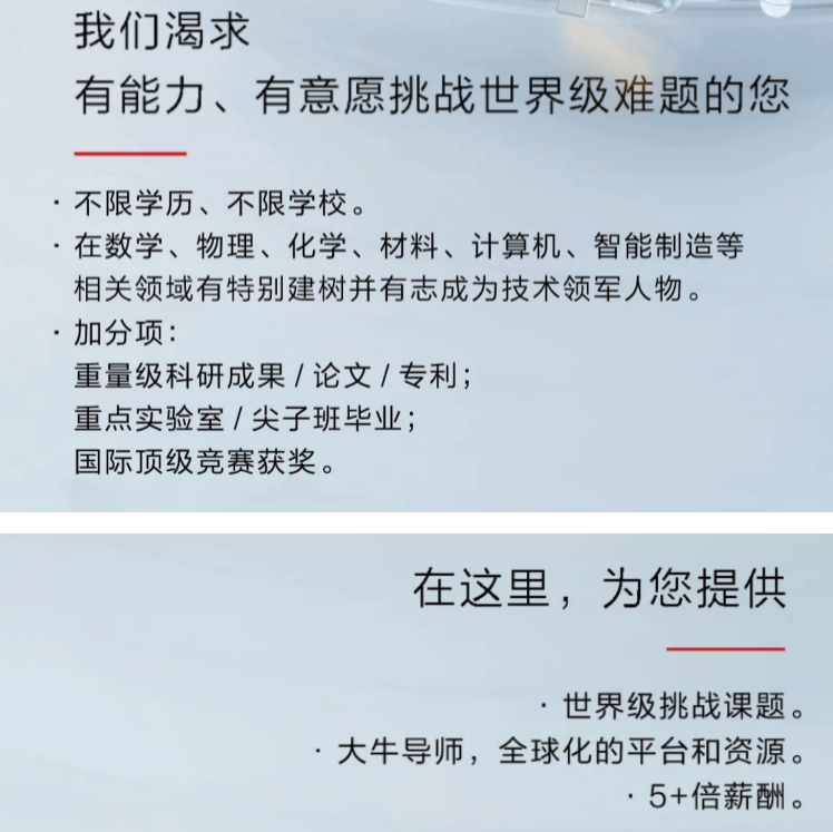 招聘要求为不限学历和学校,在数学、物理、化学、材料、计算机、智能制造等相关领域有特别建树并有志成为技术领军人物。华为方面表示,将提供 5 倍以上薪酬。