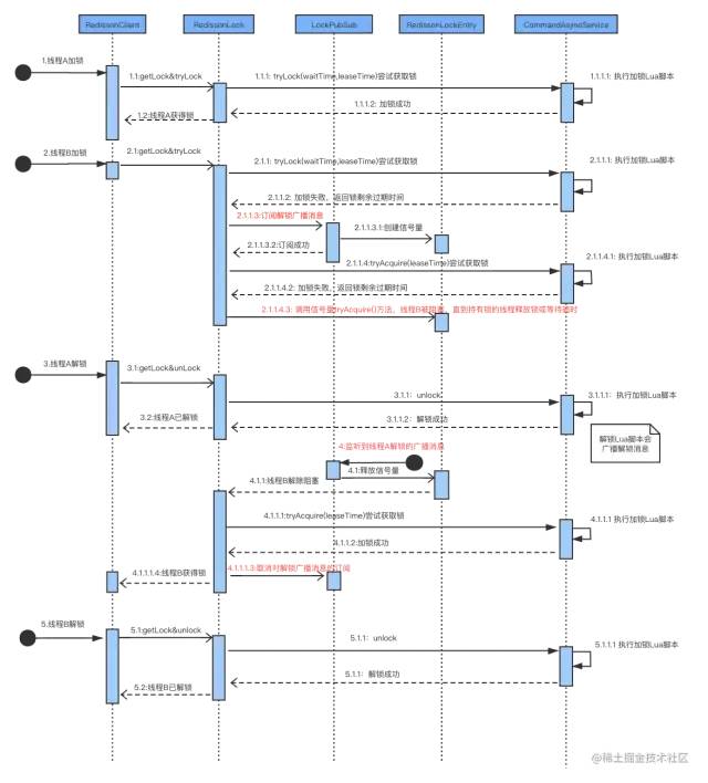 其中list维护了一个等待的线程队列redisson_lock_queue:{xxx},zSet维护了一个线程超时情况的有序集合redisson_lock_timeout:{xxx},尽管lua较长,但是可以拆分为6个步骤