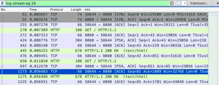 然后,关闭弹出的对话框并返回Wireshark主窗口。这时你会发现Wireshark已经自动为你设置了一个过滤表达式tcp.stream eq 24。如下图所示(图中省略了源 IP 和目的 IP):