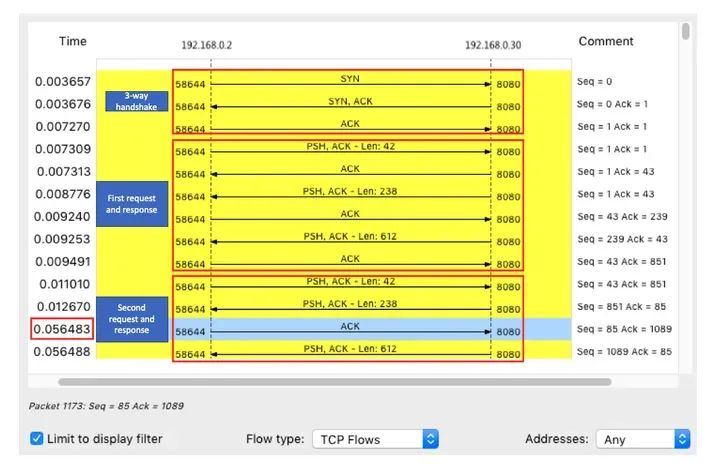 从这里,您可以看到从三次握手开始,此 TCP 连接的每个请求和响应。当然,这可能不够直观,可以继续点击菜单栏中的 Statistics -> Flow Graph,选择 “Limit to display filter”,将 Flow type 设置为 “TCP Flows”: