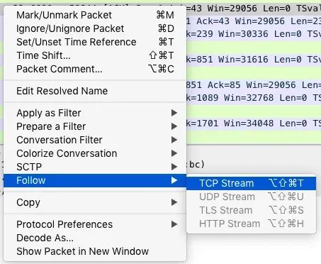 由于网络包的数量很多,我们可以先过滤一下。例如,选中一个包后,可以右键选择 “Follow”->“TCP Stream”,如下图: