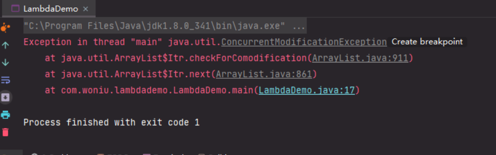 然后满怀信心的去运行,结果竟然抛 java.util.ConcurrentModificationException 异常了,翻译成中文就是:并发修改异常。