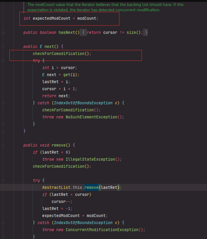 可以看出,调用 next()方法获取下一个元素时,第一行代码就是调用了 checkForComodification();,而该方法的核心逻辑就是比较 modCount 和 expectedModCount 这 2 个变量的值。