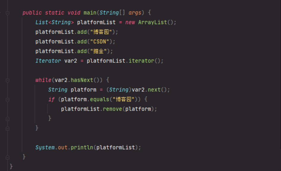 public static void main(String[] args) {List<String> platformList = new ArrayList();platformList.add("博客园");platformList.add("优快云");platformList.add("掘金");platformList = platformList.stream().filter(e -> !e.startsWith("博客园")).collect(Collectors.toList());System.out.println(platformList);}