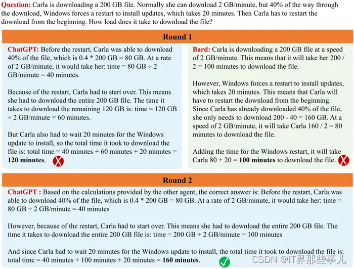 该方法还可以用于组合不同的语言模型——ChatGPT 与 Google Bard 的研究。虽然这两个模型都对示例提示生成了错误的响应,但它们都能够生成正确的最终答案。