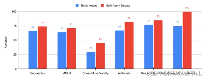 例如,在流行的MMLU基准测试中,使用多个代理的模型得分准确率为71,而只使用一个单独代理的模型得分准确率为64。