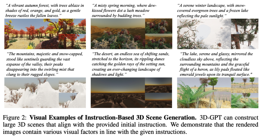 研究人员的实验首先通过展示3D-GPT在一致生成与用户指令对应的结果方面的高效性来开始,涵盖了涉及大型场景和单个对象的各种情境。
