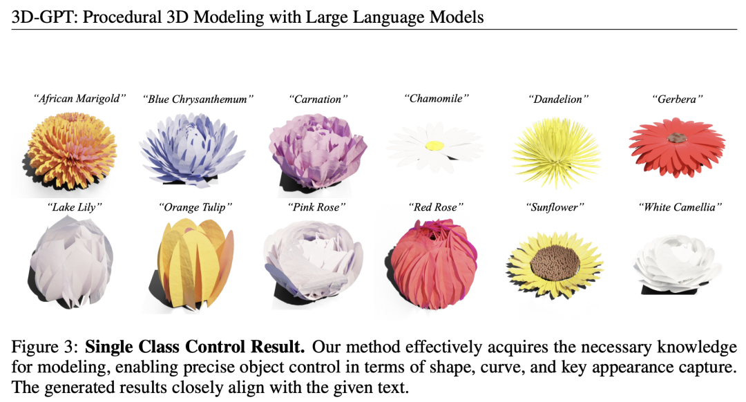 研究人员使用随机提示来指导GPT生成各种现实世界中的花朵类型。如图下3所示,研究人员的方法熟练地为每种花朵类型进行了建模,忠实地捕捉了它们不同的外观。