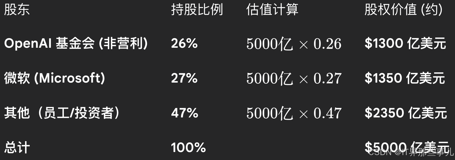 截至重组结束,OpenAI 基金会持有 OpenAI 集团 26% 的股权,根据 OpenAI 公益集团的当前估值,价值约为 1300 亿美元。微软持有 OpenAI 集团约 27% 的股份,其余 47% 由现任和前任员工和投资者持有。