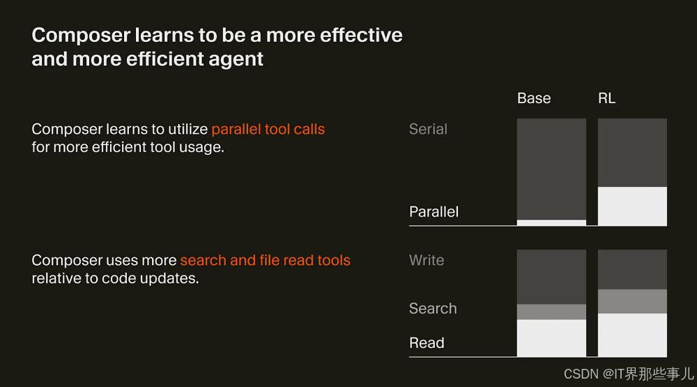Composer在强化学习过程中的优化重点是效率。Cursor鼓励模型在工具使用上做出高效选择,并在可能的情况下最大化并行处理。