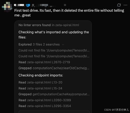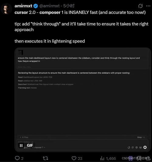 一体化分析和AB测试公司Humblytics的联合创始人amirmxt分享,如果在提示词中加入仔细思考等字样,Composer会花更多时间判断自己是否选择了正确的路径,然后再飞速执行。