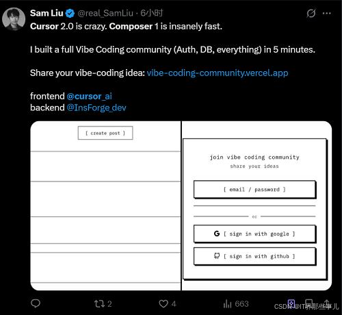 已经有不少网友分享了Composer的编程体验。开发者Sam Liu称,Composer的速度实在太快了,自己用五分钟就打造了一个完整的Vide Coding社群,还不止是光有前端,连登录验证、背后的数据库都做好了。