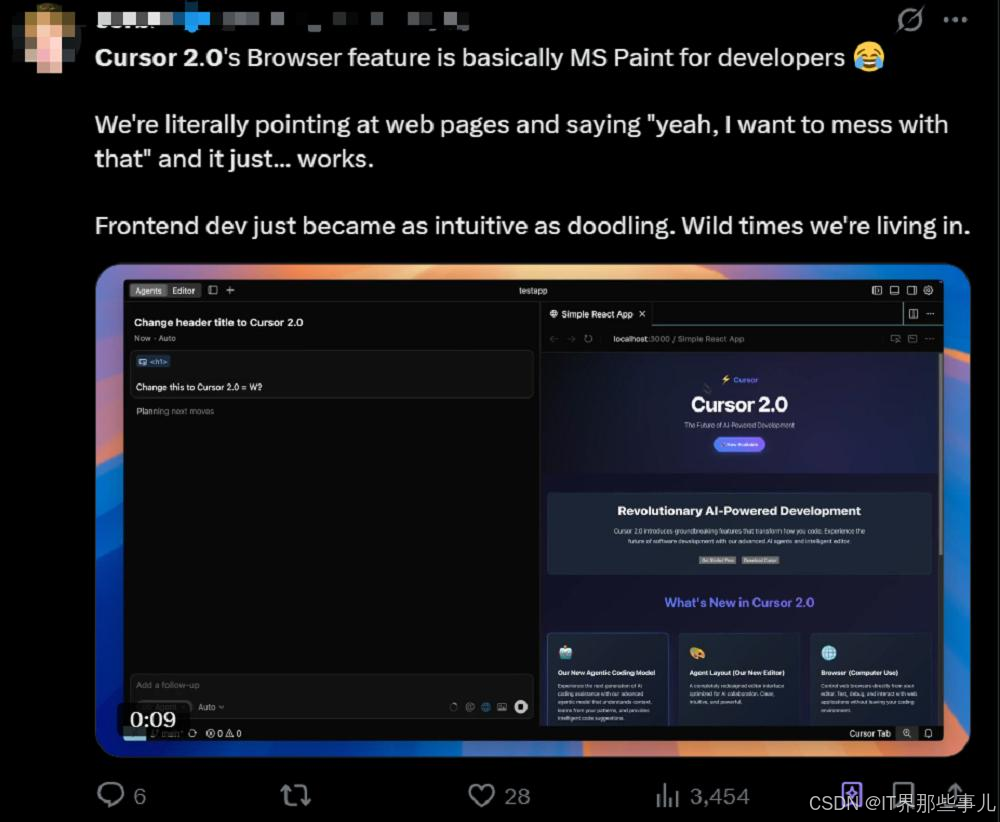 有用户反馈Cursor的浏览器功能让前端开发变得像涂鸦一样简单,直接选中要修改的内容,Cursor就能自动改好。