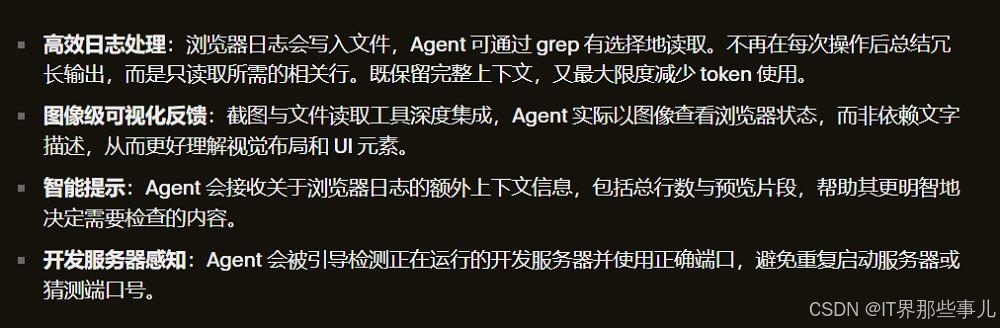 Cursor对浏览器工具进行了优化,以提升效率并减少token使用,其优化方向包括更高效的日志处理、图像级可视化反馈、智能提示、开发服务器感知等。