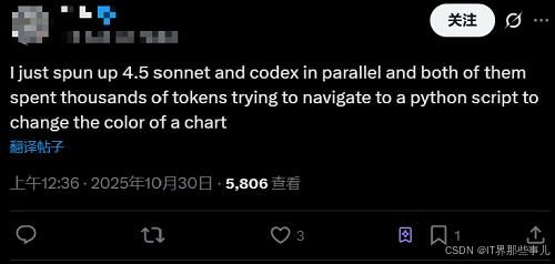 不过,烧token可能是这一模式的潜在弊端。网友分享,自己同时调用Sonnet 4.5和Codex,光是改一个图表颜色,模型就花掉了好几千个token。