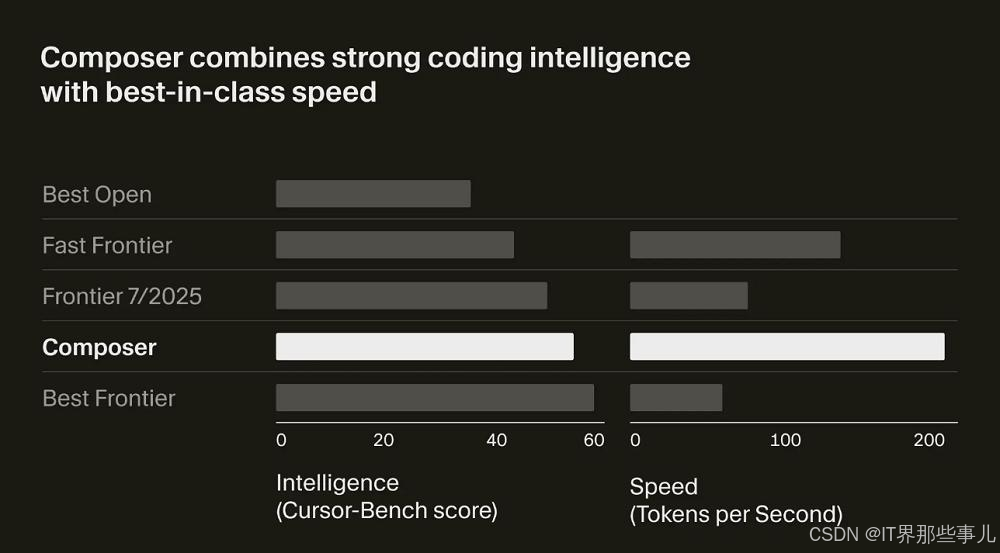 ▲Composer与前沿开源、闭源模型的智能与速度对比