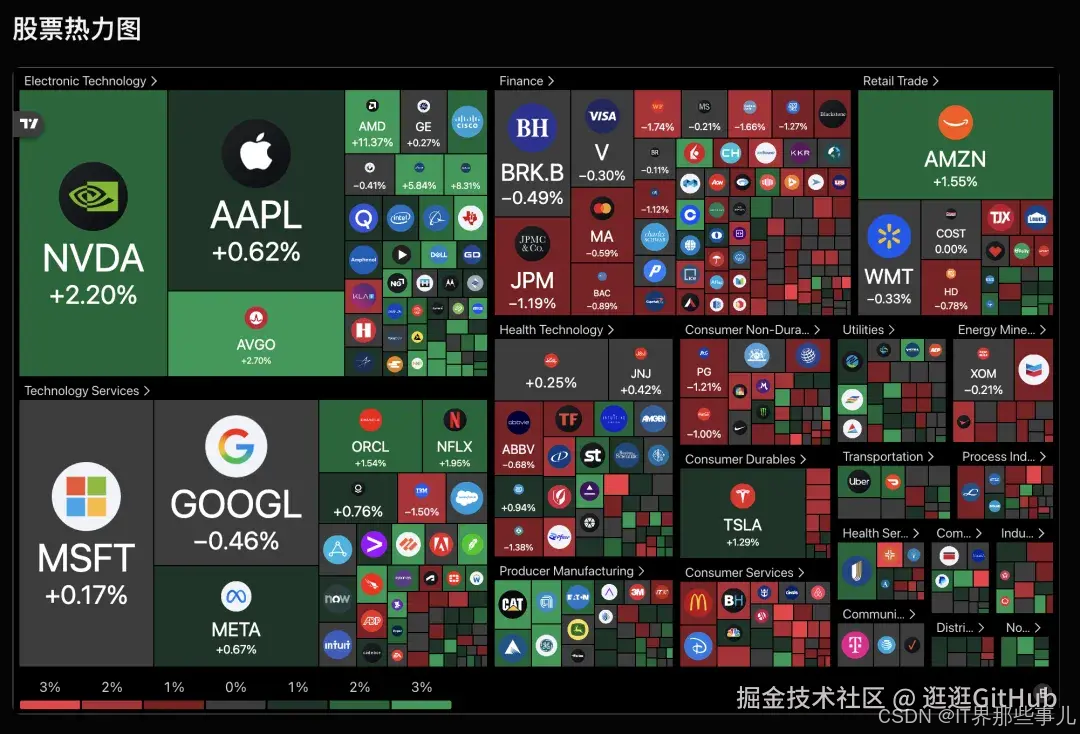 热力图的工作原理非常直观,它通过颜色和区块大小来传递信息。帮助你快速发现市场领头羊和拖后腿的板块,感知市场情绪,定位异动个股。