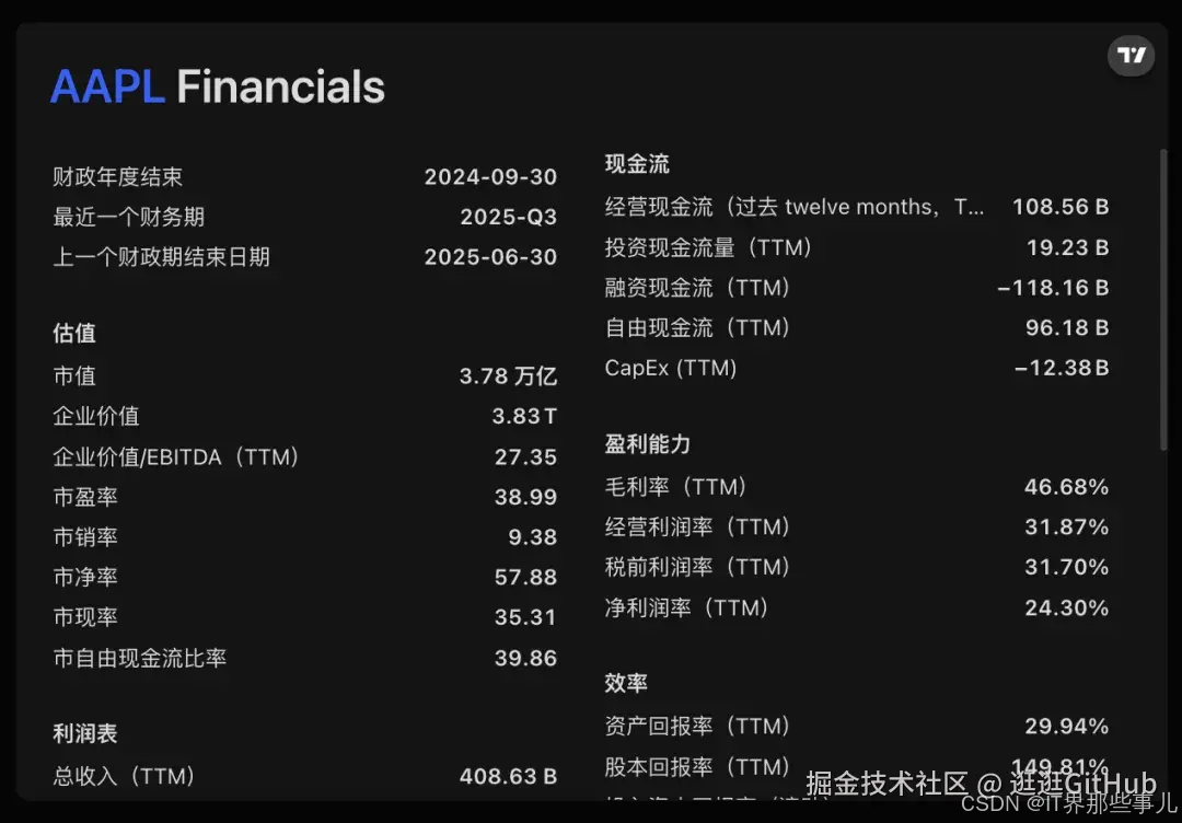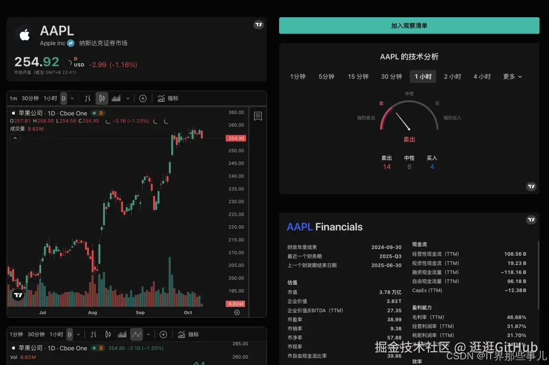 你也能创建个人观察列表,设置自己关注的股票。你看苹果公司个股看板如下,包括该公司的实时价格、K 线图,股票技术分析,财务信息。