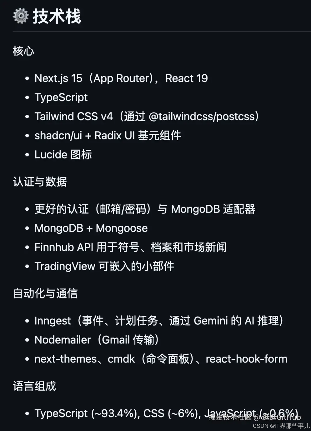 OpenStock 采用了现代 Web 开发的一系列流行技术。其前端基于 Next.js 15 和 React 19 构建,使用 TypeScript 编写,样式上则选用 Tailwind CSS v4 和 shadcn/ui 组件库,整体界面美观且支持暗色主题。